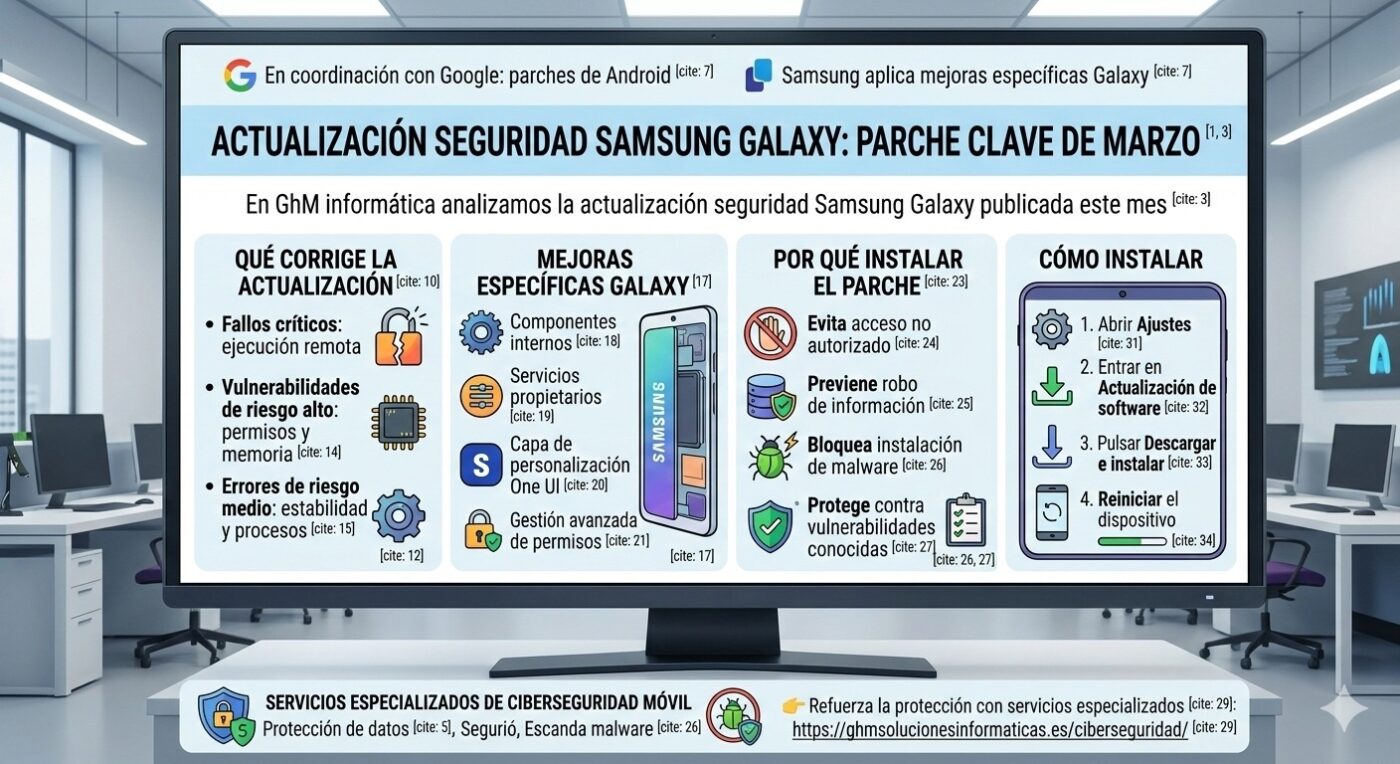 En GhM informática analizamos la actualización seguridad Samsung Galaxy publicada este mes, un despliegue que refuerza la protección de los dispositivos frente a vulnerabilidades críticas y fallos de estabilidad. Este parche mensual mejora la seguridad del sistema operativo, reduce riesgos de intrusión y fortalece la protección de datos personales y corporativos.