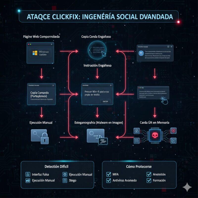 La clave es que el atacante no intenta ejecutar el malware automáticamente —algo que un antivirus bloquearía— sino que induce al usuario a hacerlo voluntariamente.