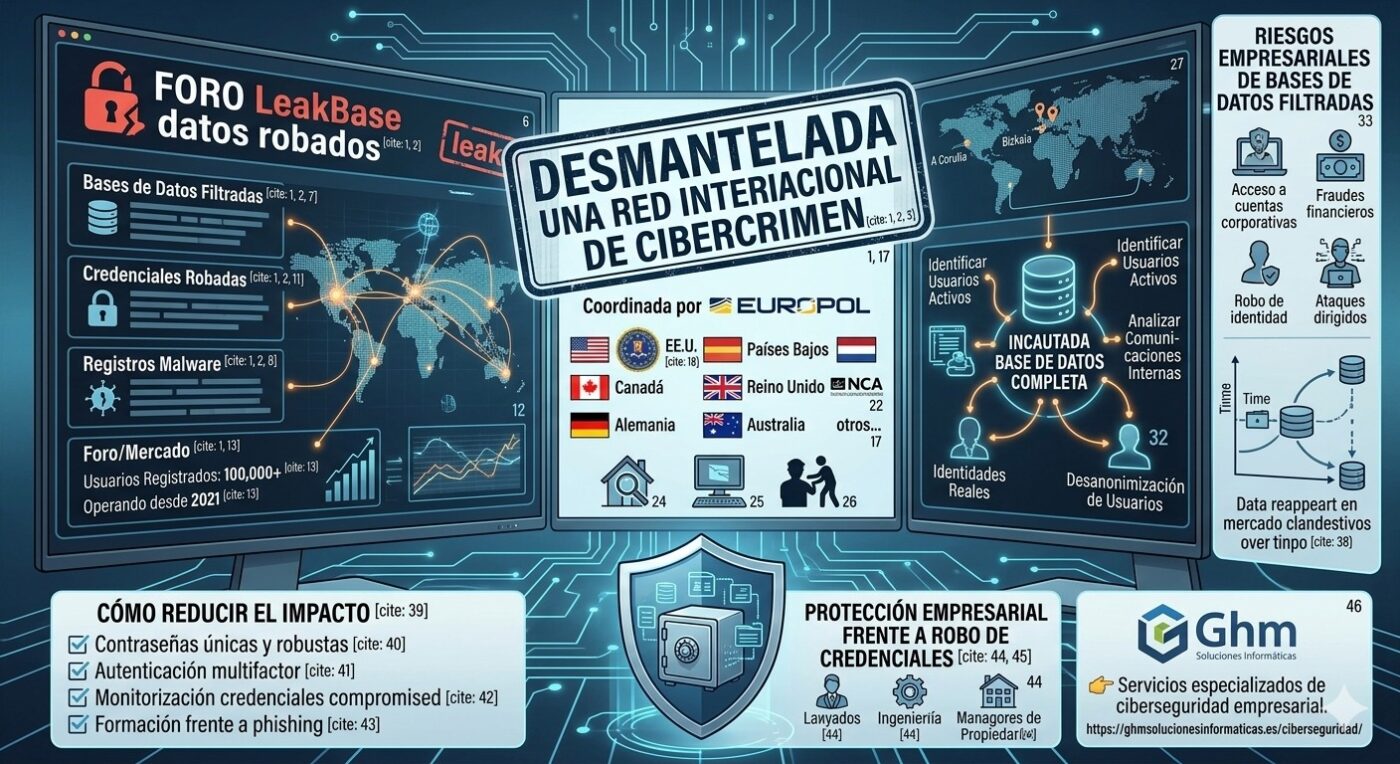 En Ghm Soluciones Informáticas analizamos la reciente operación internacional contra el foro LeakBase datos robados, una de las plataformas clandestinas utilizadas para comercializar bases de datos filtradas, credenciales robadas y registros obtenidos mediante malware. La investigación, coordinada por Europol, ha implicado a autoridades policiales de varios países y ha permitido identificar a usuarios vinculados con […]