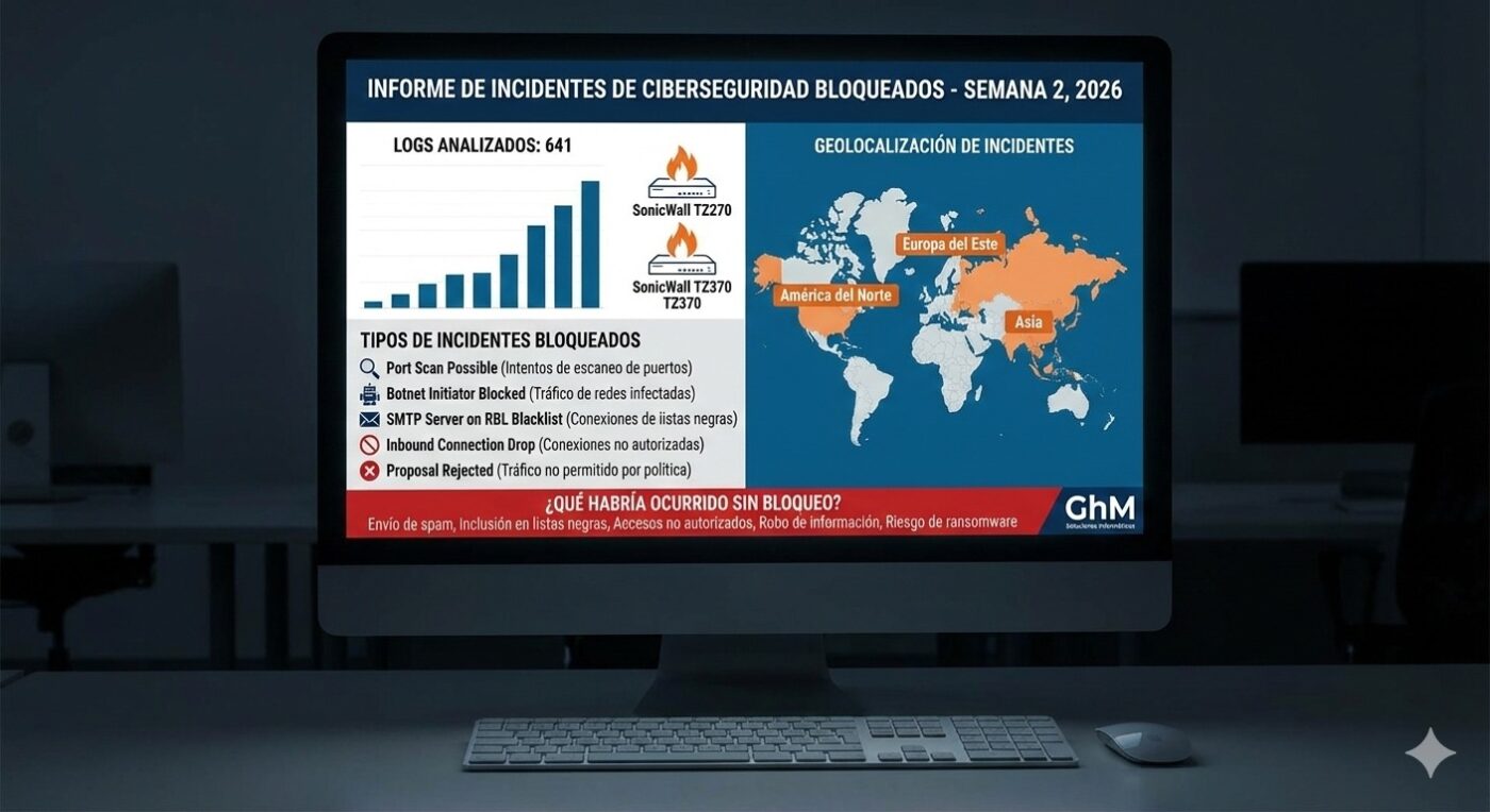 Durante la segunda semana de 2026 se han analizado 641 logs de seguridad, correspondientes a eventos detectados y bloqueados por firewalls SonicWall TZ270 y TZ370. Este análisis forma parte del seguimiento continuo de incidentes de ciberseguridad en entornos reales, donde la protección perimetral es clave para evitar impactos graves en la actividad diaria de las organizaciones.