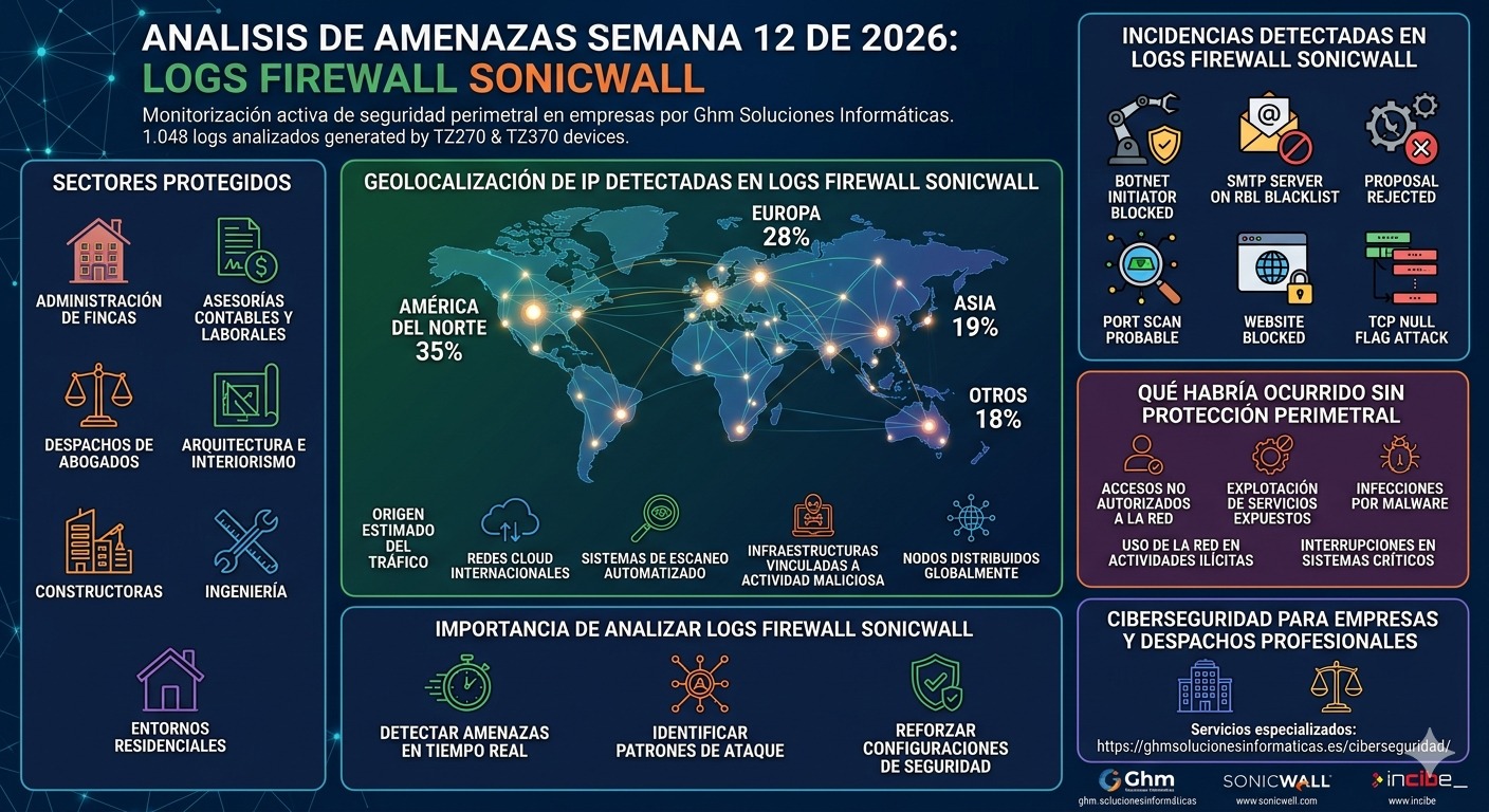 Publicado 23 marzo, 2026 en 1408 &veces; 768 en Logs firewall SonicWall: análisis de amenazas semana 12 de 2026