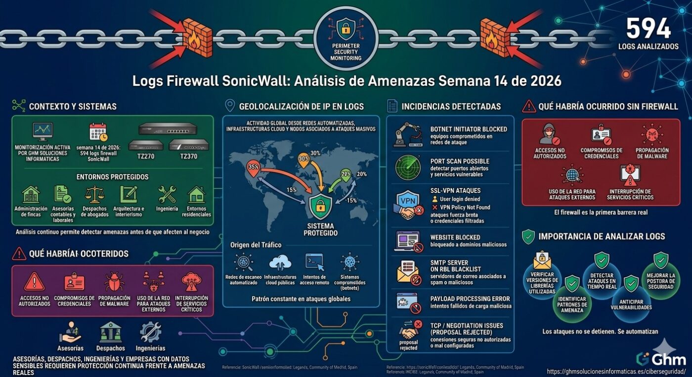 En Ghm Soluciones Informáticas seguimos monitorizando la seguridad perimetral en empresas. Durante la semana 14 de 2026, se han analizado 594 logs firewall SonicWall procedentes de dispositivos TZ270 y TZ370.
