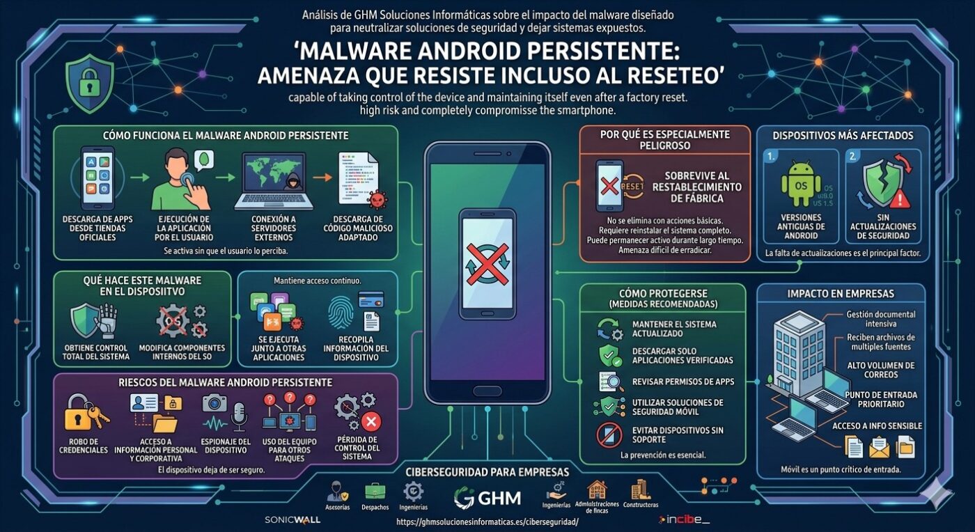 En Ghm Soluciones Informáticas analizamos una amenaza crítica: el malware Android persistente, capaz de tomar el control del dispositivo y mantenerse incluso tras un restablecimiento de fábrica.