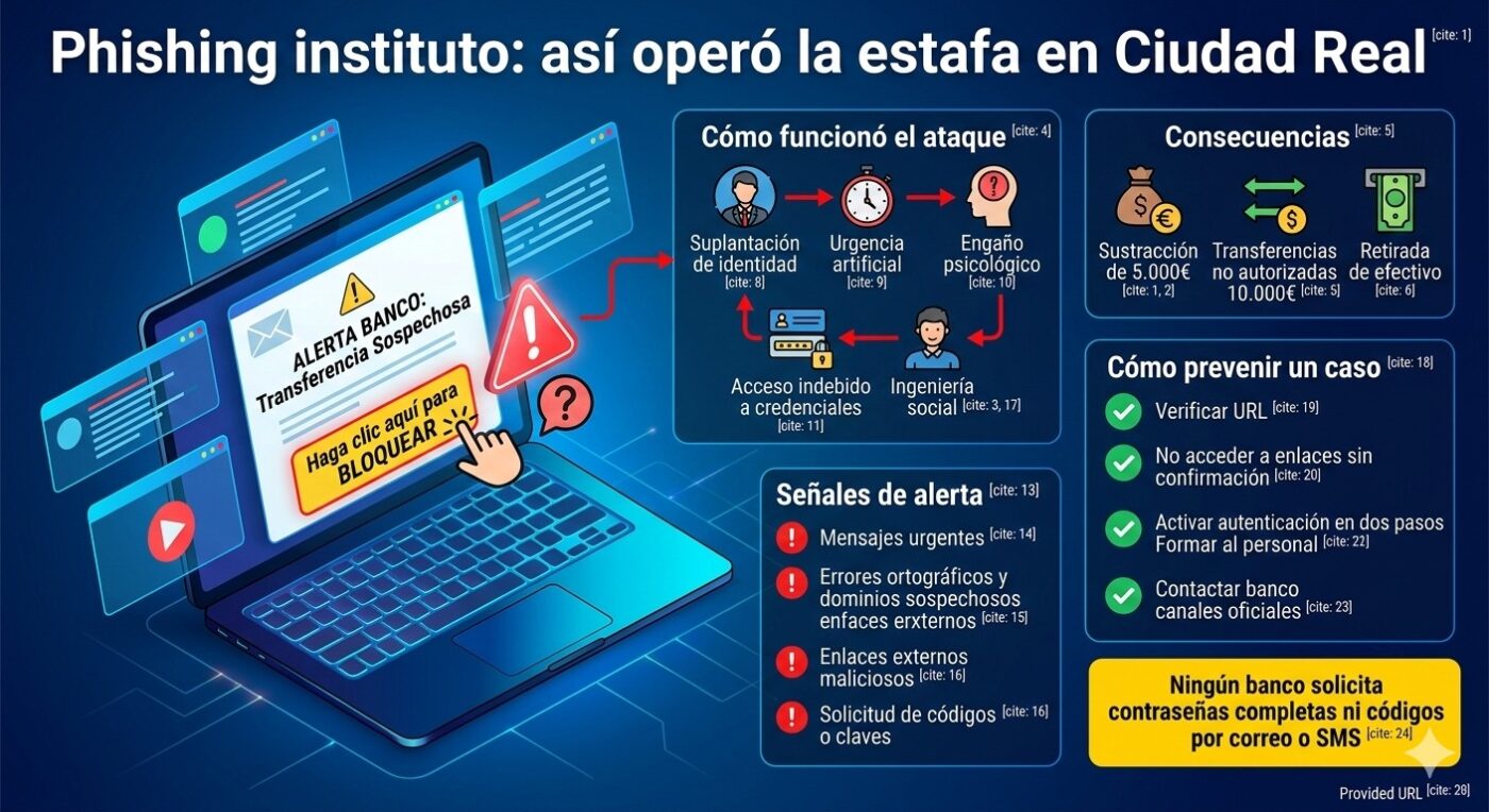 El phishing instituto vuelve a situar a los centros educativos en el punto de mira del fraude digital. Un Instituto de Educación Secundaria de Ciudad Real fue víctima de una estafa bancaria que terminó con la sustracción de aproximadamente 5.000 euros.