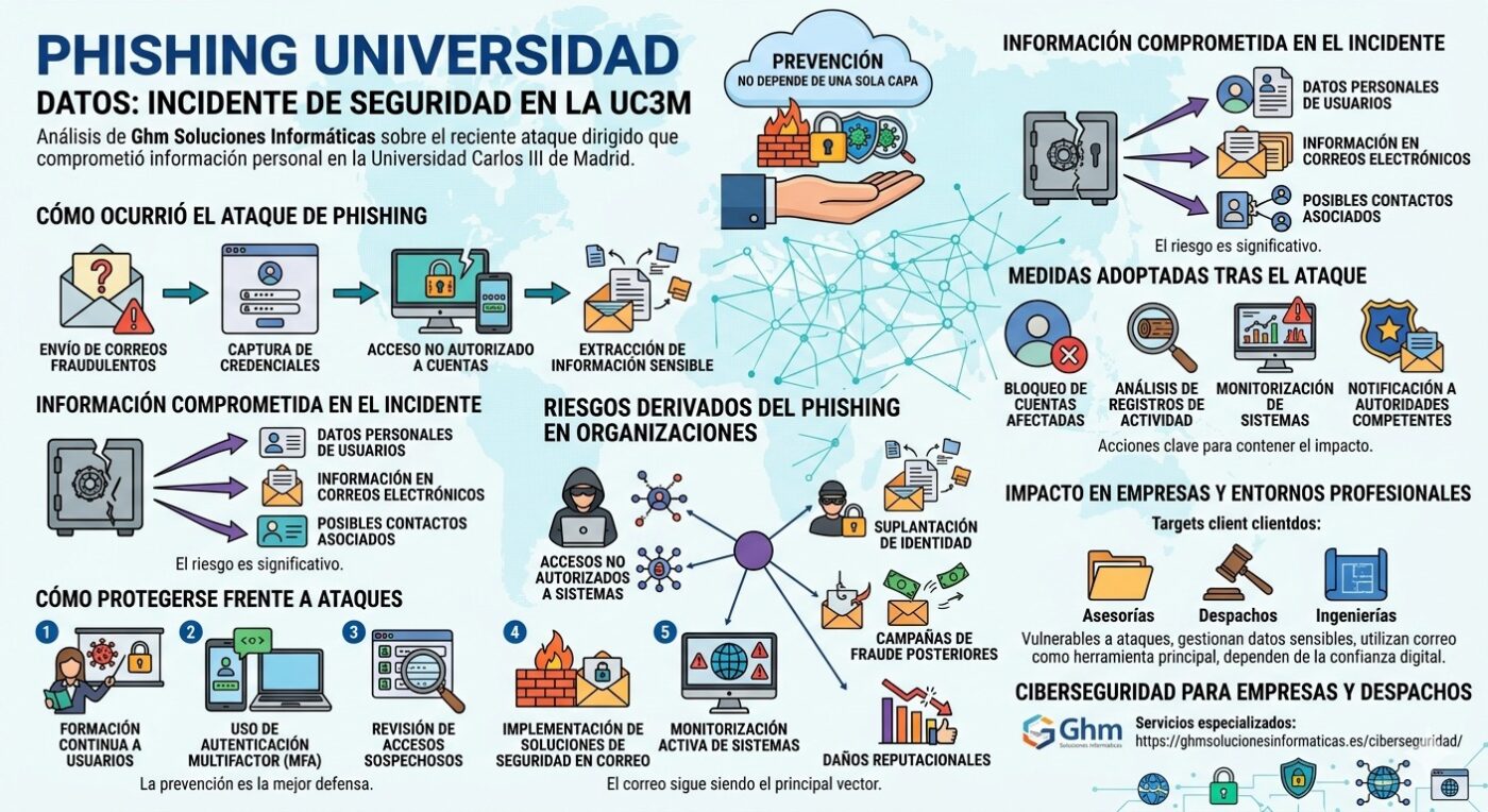 En Ghm Soluciones Informáticas analizamos un reciente caso de phishing universidad datos, donde un ataque dirigido ha comprometido información personal en la Universidad Carlos III de Madrid.