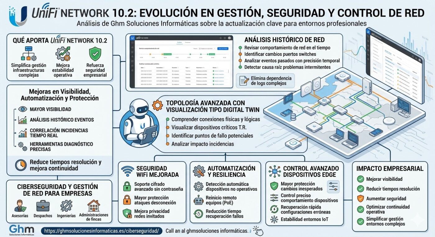En Ghm Soluciones Informáticas analizamos UniFi Network 10.2, una actualización que introduce mejoras clave en visibilidad, automatización y protección en entornos de red profesionales.