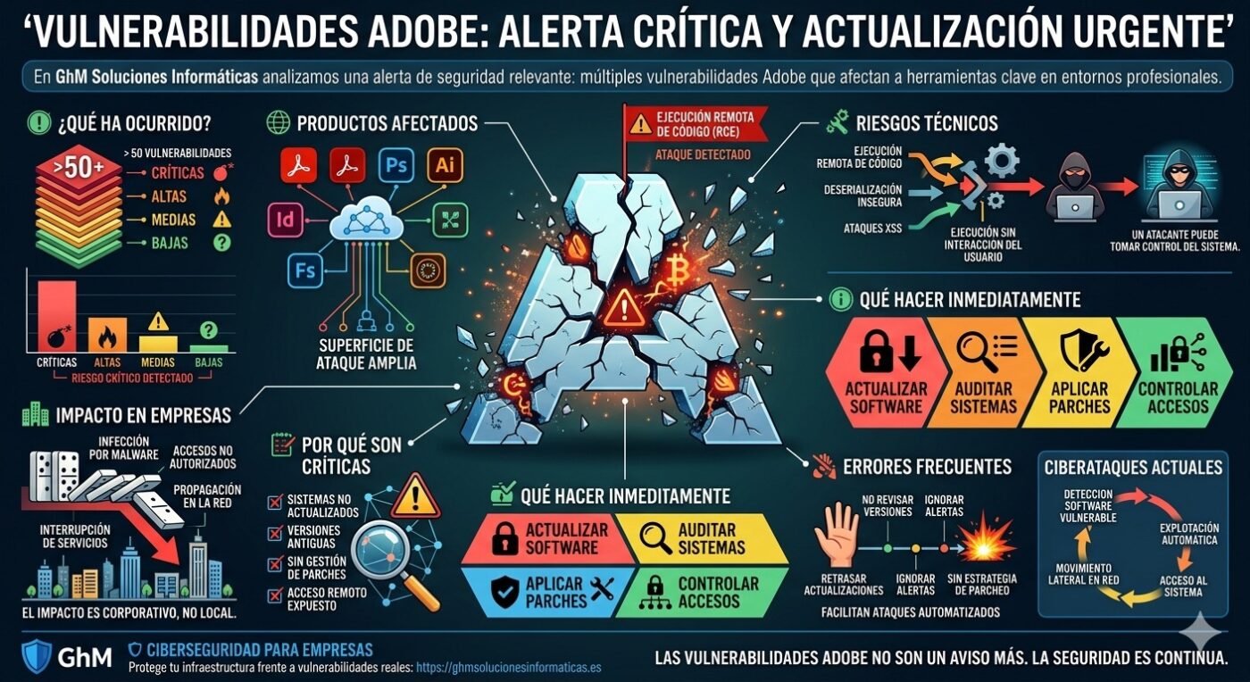 En GhM Soluciones Informáticas analizamos una alerta de seguridad relevante: múltiples vulnerabilidades Adobe que afectan a herramientas clave en entornos profesionales.