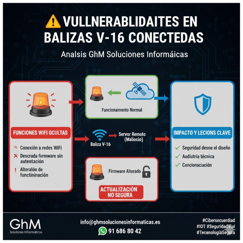 Las vulnerabilidades balizas V-16 se han convertido en un asunto crítico tras descubrirse funciones WiFi no documentadas que permiten modificar el firmware de determinados modelos homologados en España. Este hallazgo pone en duda la seguridad de dispositivos que forman parte del ecosistema oficial de seguridad vial y que transmiten información directamente a sistemas centrales de tráfico.