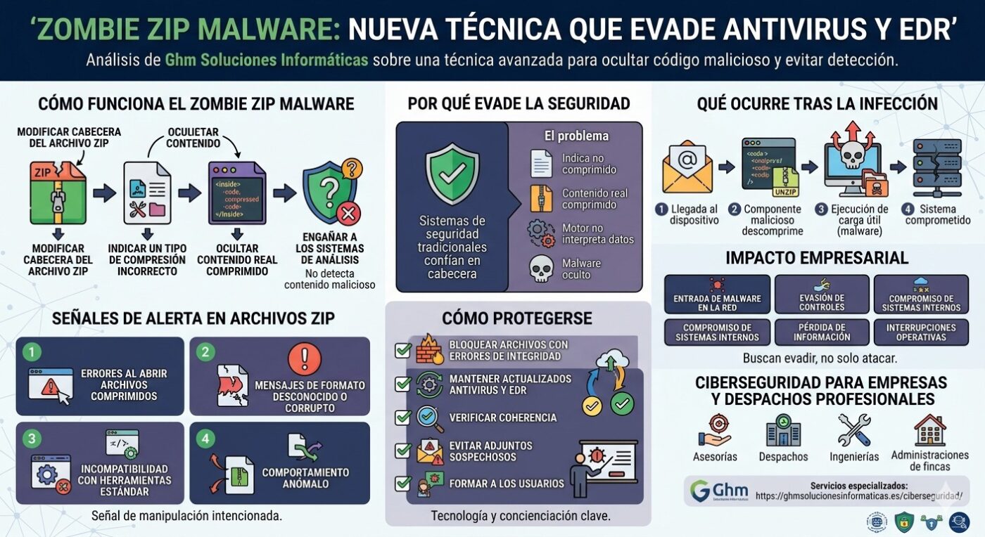 En Ghm Soluciones Informáticas analizamos una nueva amenaza conocida como Zombie ZIP malware, una técnica avanzada que permite ocultar código malicioso dentro de archivos comprimidos evitando su detección por herramientas de seguridad.